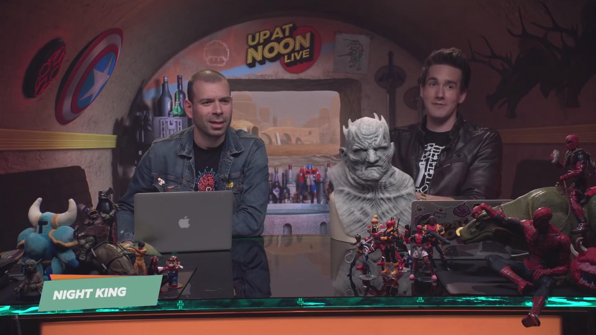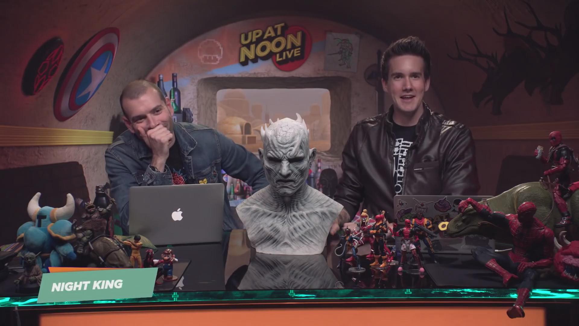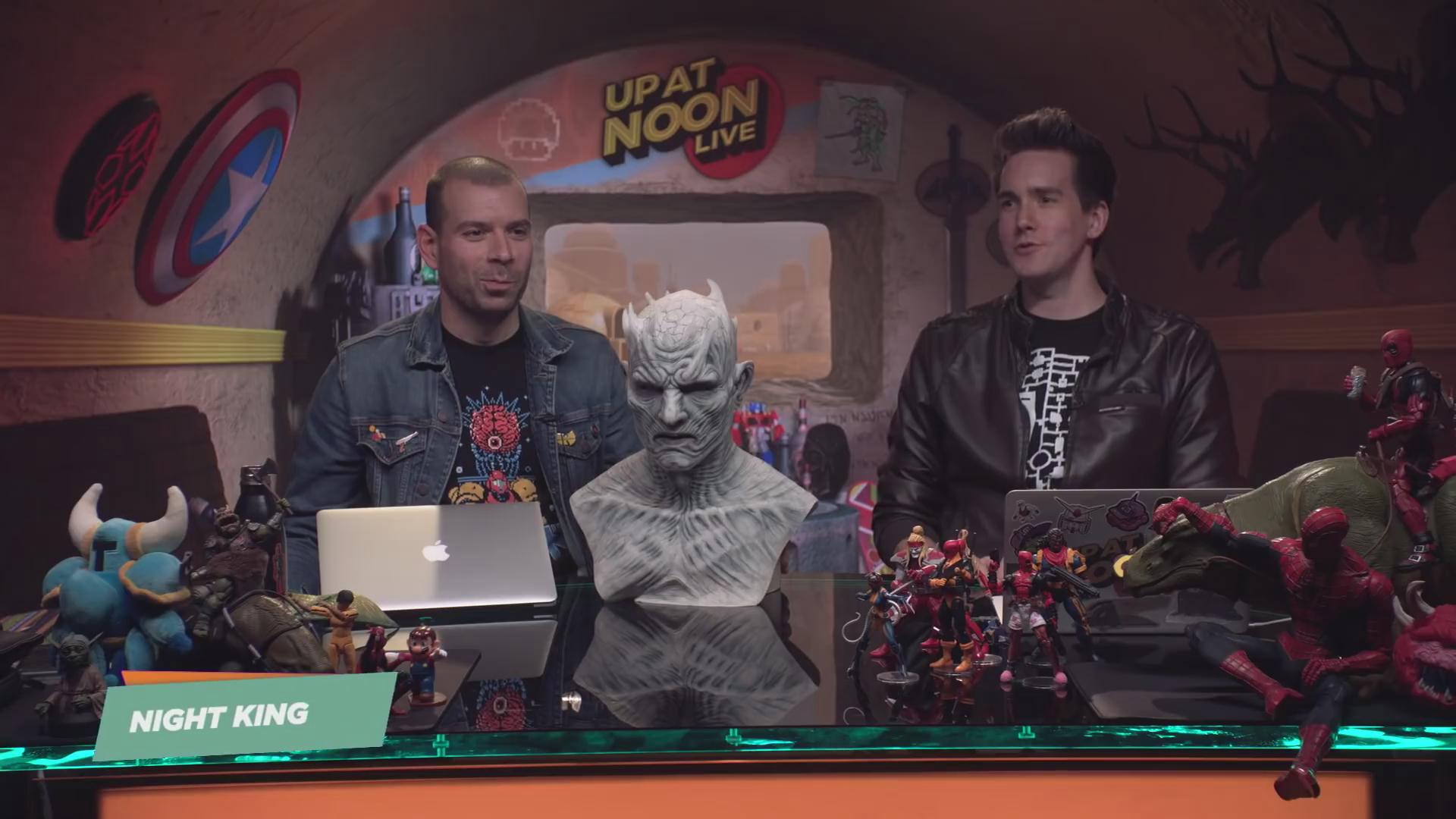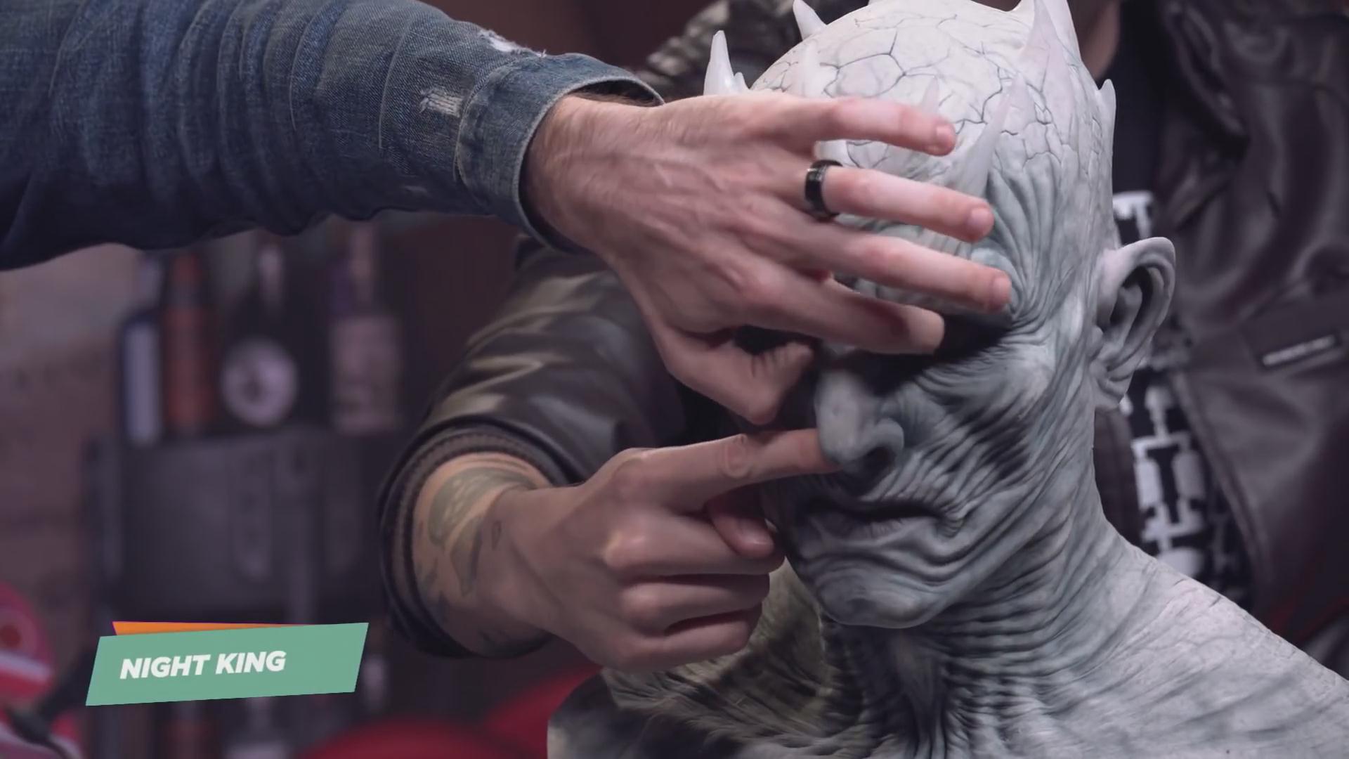 从视频来看,面具细节非常出色,两位主持人Brian Altano和Max Scoville也是调皮了一番,挖鼻孔,已婚的Brian甚至跟夜王接吻,有点辣眼睛,后来他们又夜王戴了顶草帽,遗憾的是,最后并没有给大家看看试戴效果。