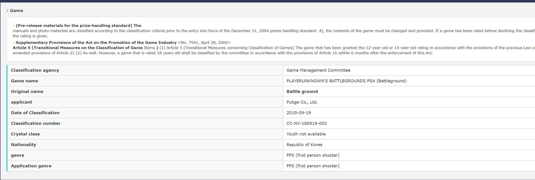 下图是韩国游戏分级机构对《绝地求生》PS4版的评级页面截图,原文是韩文,已经通过谷歌翻译成了英文。通过下图可知,申请人是PUBG公司,时间是今天。
