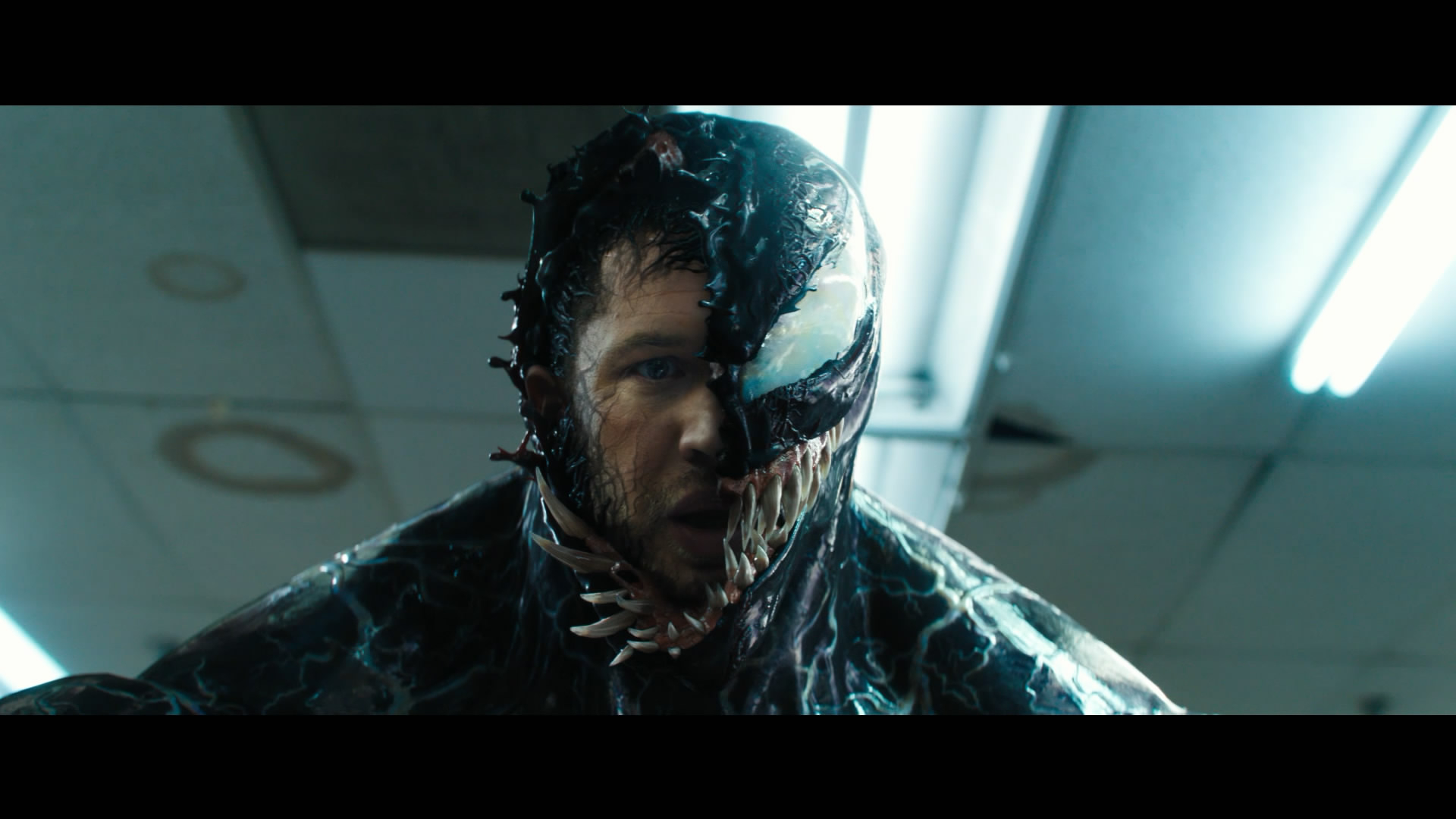 你在荧幕上看到的毒液从头到尾都是汤姆·哈迪扮演的。他的表演动作告诉了特效团队应该如何设计毒液从艾迪身体中分离出来的场面——无论是黑色触手从他体内钻出,还是毒液的头部从他身上分裂出来和他对话。在《蝙蝠侠:黑暗骑士崛起(The Dark Knight Rises)》中富兰克林就与哈迪有过合作,而在《毒液》中,他的特效团队会非常精确地捕捉哈迪的动作,并以此为原点来创作虚拟的毒液形象。这也意味着哈迪在很多时候都是以蓝幕为背景在表演,富兰克林向我们表示,哈迪对此是欣然接受的。