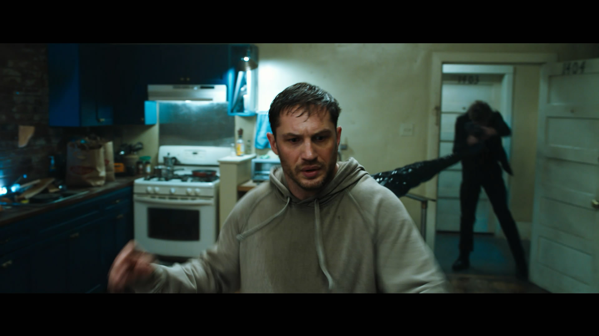 至于哈迪,他需要同时饰演两个角色,表演出他们的体态和动作。而在这个片段中,由于毒液的影响,艾迪要与要与自己的身体对抗。