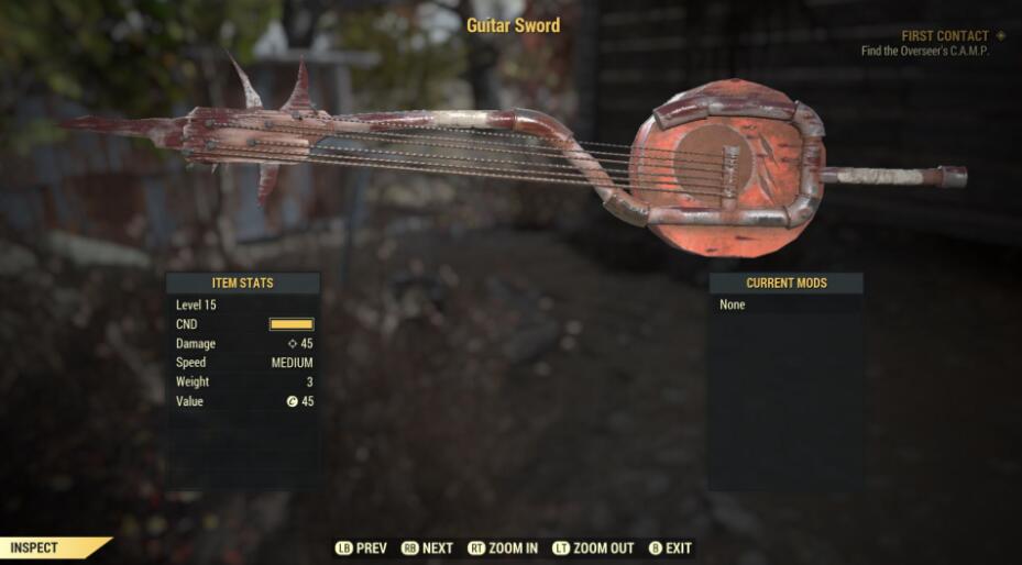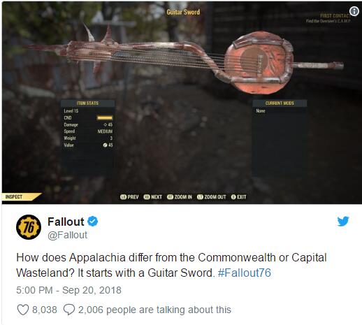 辐射官方推特近日在推文中巧妙地放出,同时曝光的还有一张长得像吉他的剑的奇怪图片。从图片上看,系列之前的耐久度设定已经回归了,因为图像上有一个标为“CND”的耐久条。