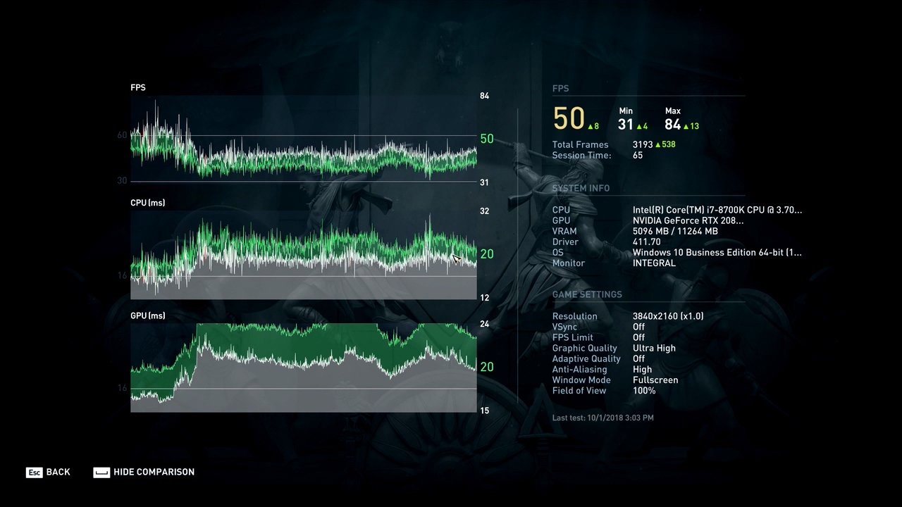 根据《刺客信条:奥德赛》自带的基准测试工具,RTX 2080Ti和GTX 1080Ti二者最终成绩如下: