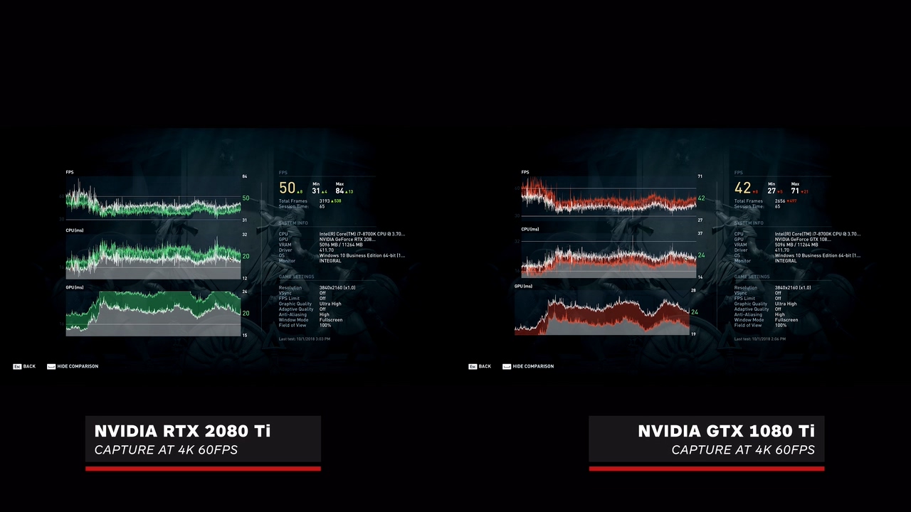 RTX 2080Ti:4K分辨率下平均帧数为50,最高帧数为84,最低帧数为31