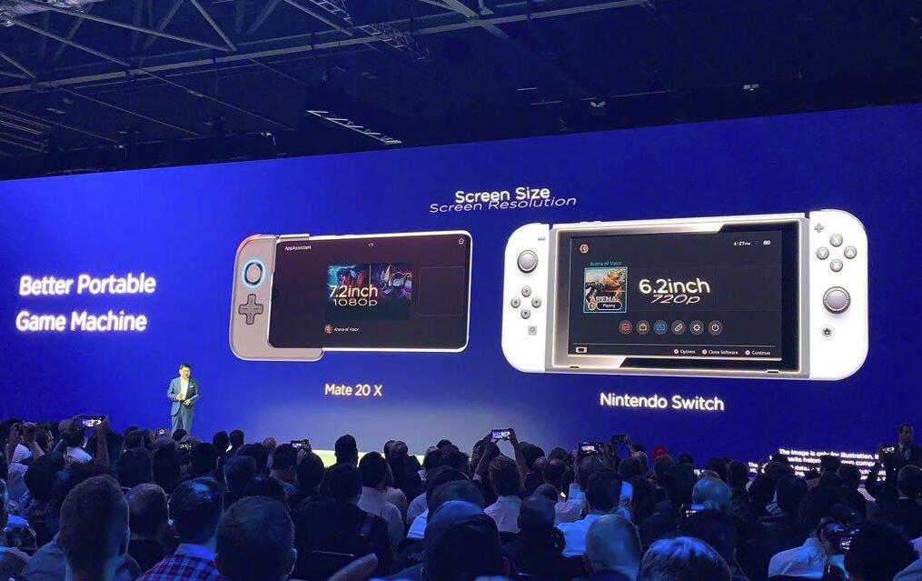 Mate 20X还支持M-Pen手写笔,这支笔可以分辨4096级压感,可随时做笔记,搭配华为特制手柄还可以直接变身为掌上游戏机,对抗任天堂Switch。在发布会现场使用的PPT上,华为将任天堂Switch作为对象进行对比。宣传使用比Switch容量更大的电池、分辨率和尺寸更高的屏幕等卖点。