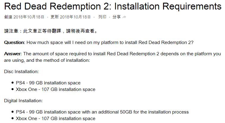 10月份家用机平台最大头的游戏就是Rockstar即将推出的《荒野大镖客2》,这款游戏将在PS4和XboxOne平台同时发售。在发售之前曾有多方消息发布该游戏将占据超过100G空间,PS和Xbox两方粉丝也因个版本容量差异产生争论,今天争论将结束,因为Rockstar官方正式发布了PS4和XboxOne双版本《荒野大镖客2》所需硬盘空间。