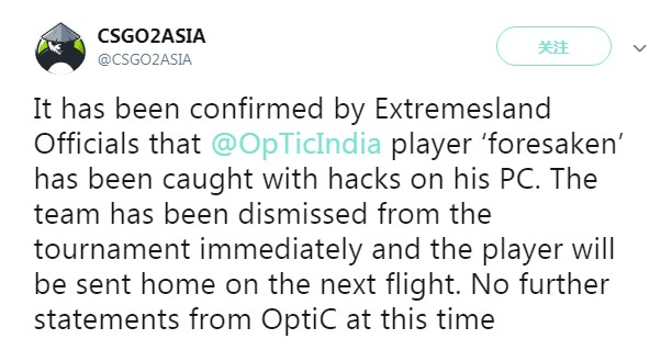 在10月19日举办的2018《CS:GO》eXTREMESLAND亚洲总决赛中,印度战队OpTic Gaming的选手forsaken被抓住在比赛中使用Hack(一种瞄准辅助软件)外挂程序作弊,结果导致OpTic Gaming战队全员被开除。