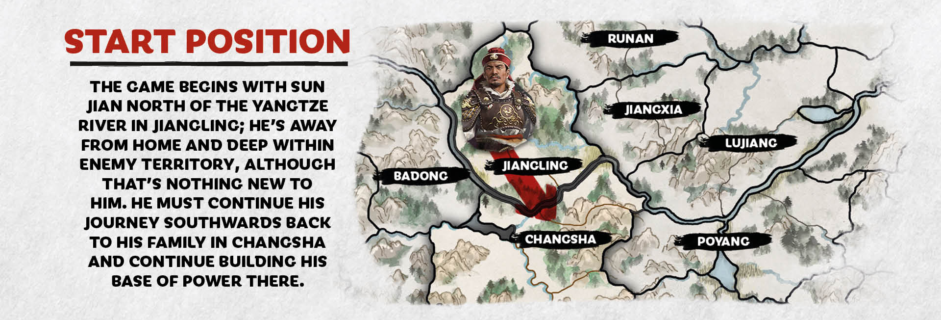 游戏开局时,孙坚处于长江以北的江陵,他远离家乡,深入敌境。他必须尽快南下回到自己的根据地,巩固自己在长沙的统治。为了实现这一目标,他前期需要与东汉政权作战(原文the Han Empire,绝无可能是隔壁翻译的蜀汉)。