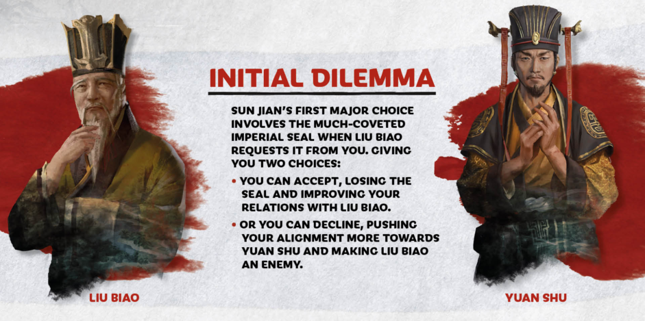 每个可玩势力在战役初期在完成一些先决条件后,就会触发初期困境。这些困境事件,将使玩家进行抉择,是继续按着历史发展游戏,还是走一条属于自己的道路(此前已有报道,演义和经典模式中,事件会略有不同)。比如,作为孙坚,玩家会触发刘表索要传国玉玺事件,你可以选择拒绝他,并且联合袁术与刘表为敌,也可以选择同意交出玉玺,你将会失去这一物品,同时会与刘表提升好感。正如《全战》其他作品所做的,玩家可以按自己的想法影响历史的走向。