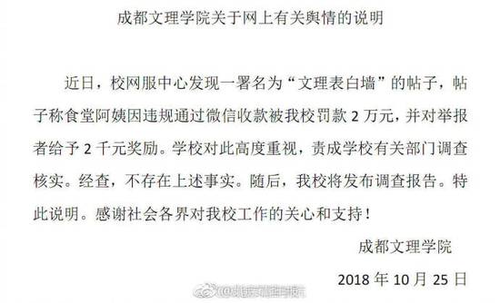 在爆料之后,成都文理学院今天下午发布情况说明介绍,称对此高度重视,责成学校有关部门调查核实。经查,不存在上述事实。