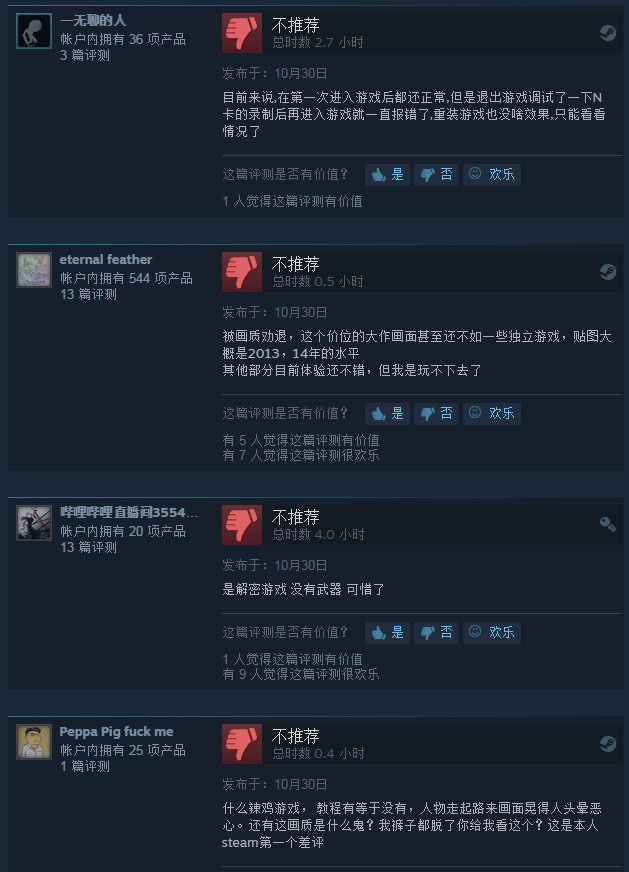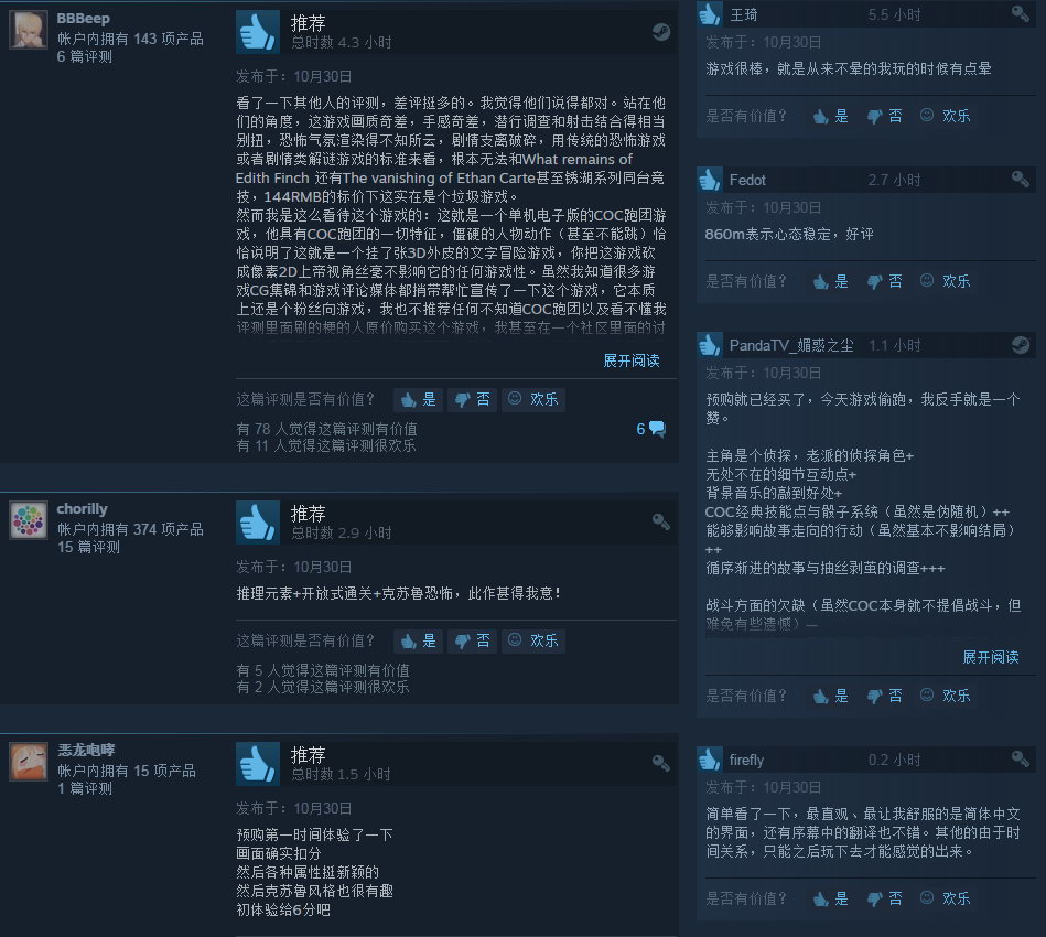 《克苏鲁的呼唤》Steam上售价为144元,有玩家表示推理元素+开放式通关+克苏鲁恐怖很不错,游戏剧情跌宕起伏。还有玩家感慨简体中文界面很舒服,翻译不错。但也有玩家表示游戏的画质和渲染不太出色,战斗方面有所欠缺。