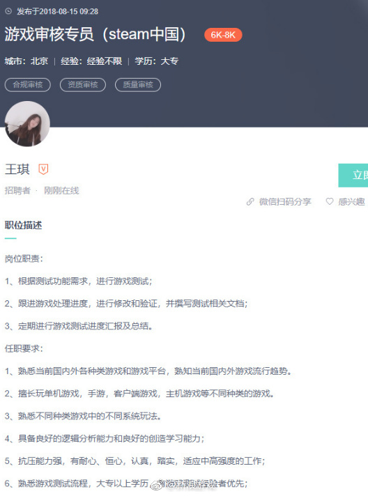 某直聘网站Steam中国“游戏审核专员”招聘信息