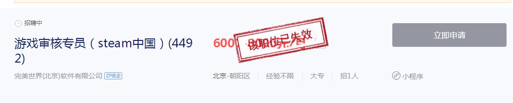 今日多家招聘网站上显示Steam中国在招聘“游戏审核专员”,但是招聘单位均显示是完美世界,现在这个月薪6000~8000的“游戏审核专员”岗位已经取消,原因不明。