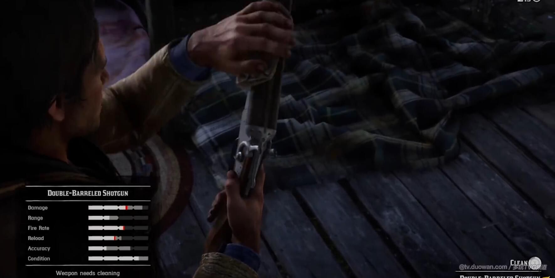 玩家在游戏中需要注意自己的武器不能太脏或者是太湿,这会导致枪支卡壳,玩家可以通过定期擦拭武器来避免这一点,而在擦拭的时候玩家还能看到亚瑟拿出抹布来,一点点将枪支上的污渍用油擦除。