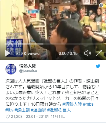 预定11月18日播放的《情热大陆》节目中,著名漫画家谏山创确定参演,而近日放出的官方预告竟声称谏山创的传奇代表作《进击的巨人》即将完结?!一起来了解下!