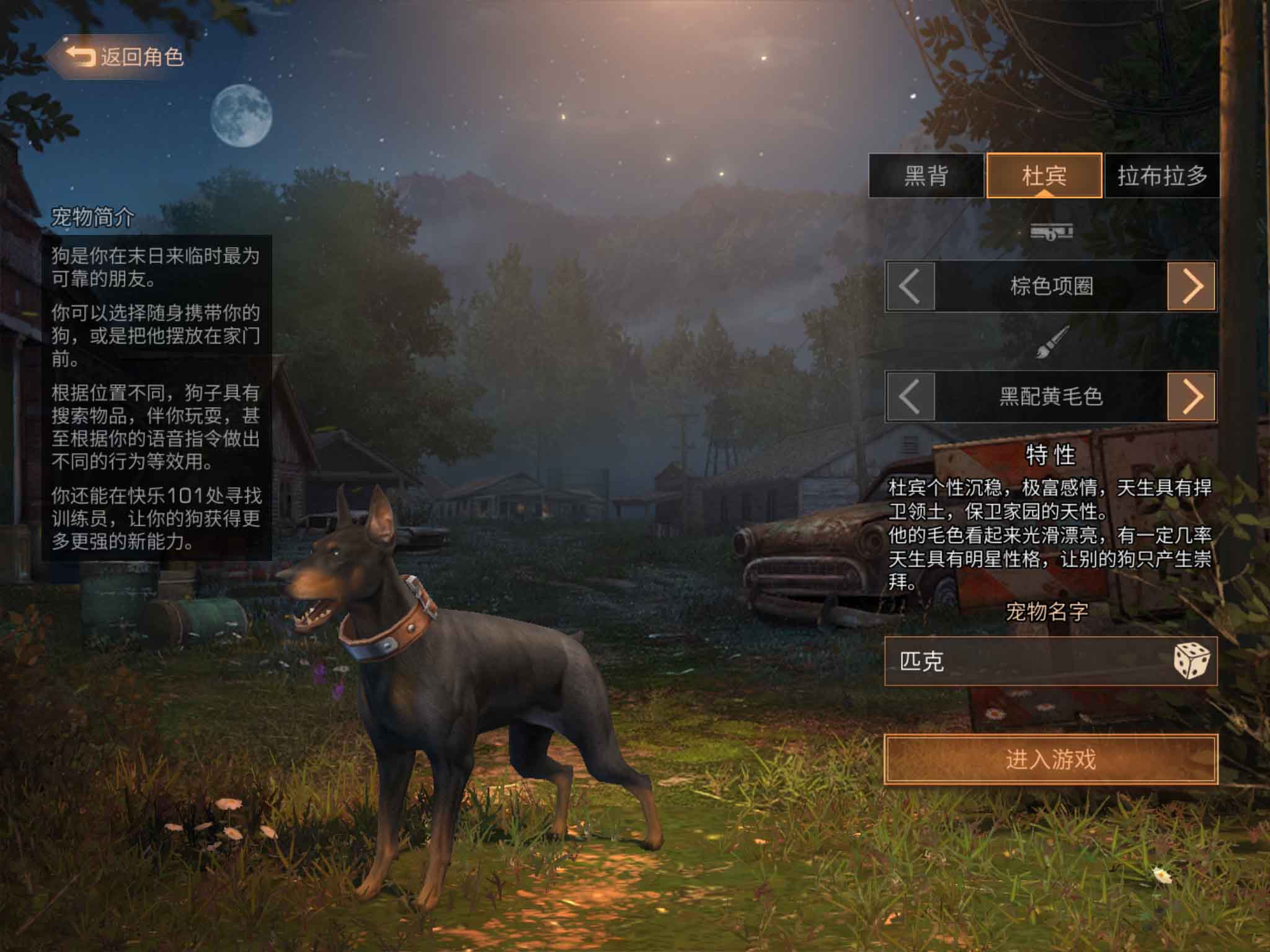 游戏在一开始创建人物的时候还能给自己选择一直动物伙伴,一共有黑背、杜宾、拉布拉多三种品种的狗狗可以选择。