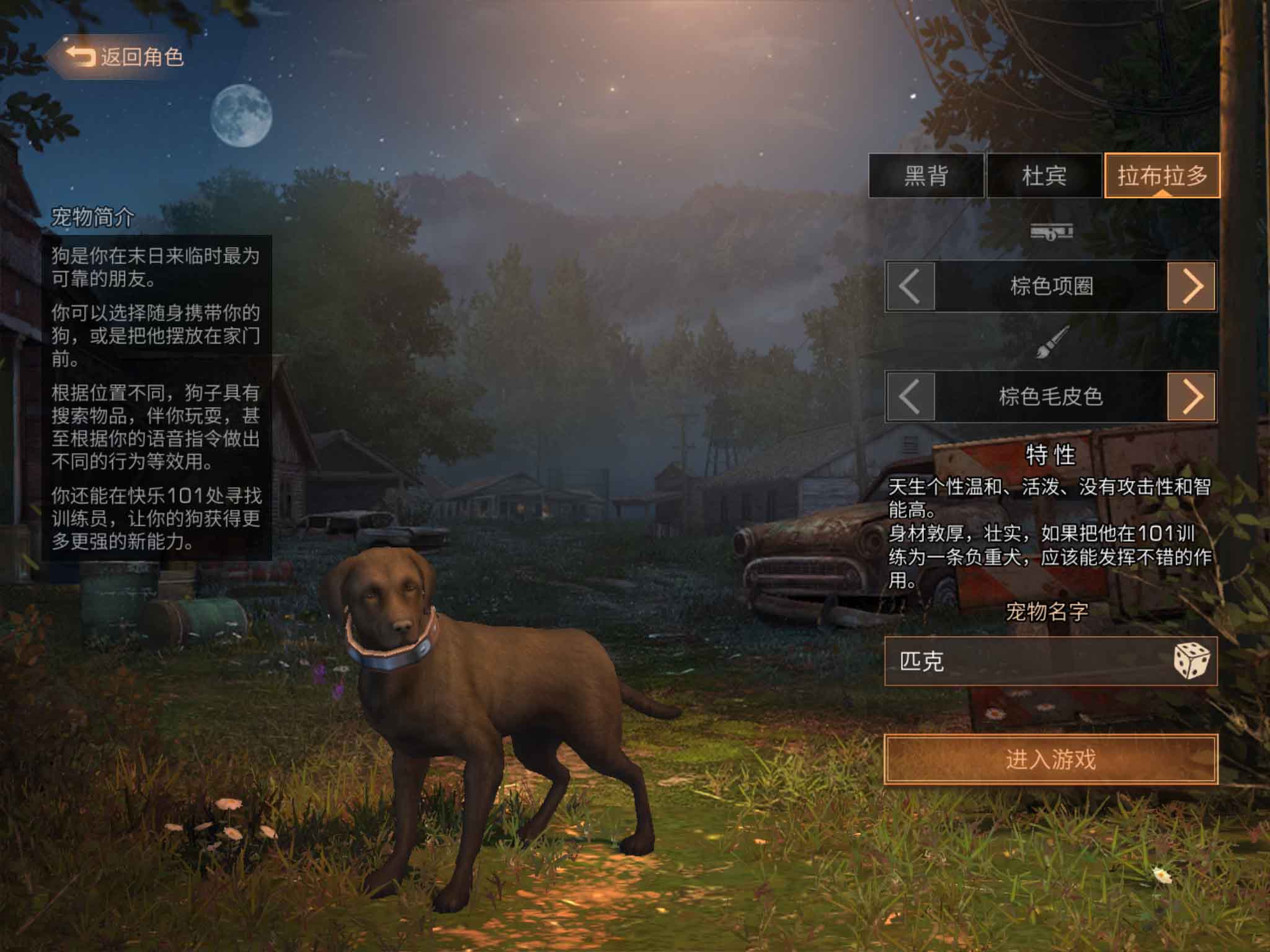 不过在游戏中三种犬类并没有数值上的差别,玩家们只需要根据个人喜好选择即可。之后玩家可以让宠物成为看家犬、搜救犬、负重犬三个类型中的一种,能够提供更多的帮助。