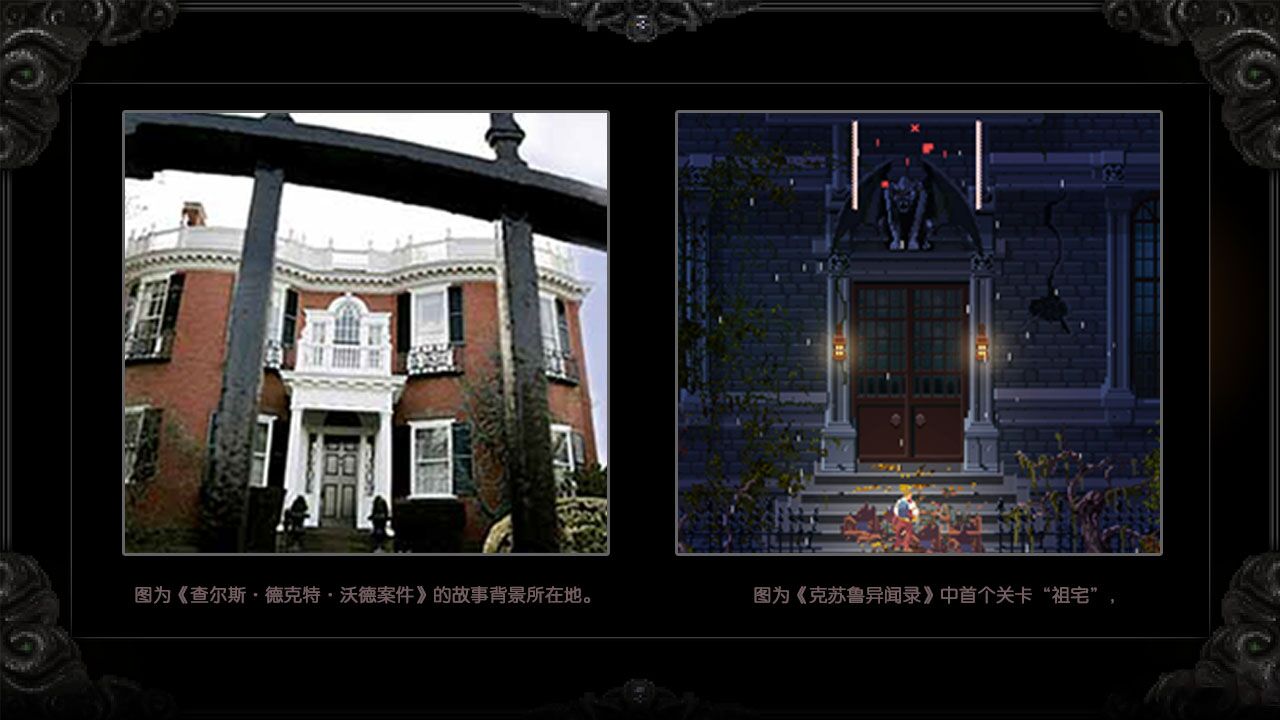 《克苏鲁异闻录》的故事背景设定及其详尽地还原了洛夫克拉夫特笔下的众多小说场景,其中《查尔斯·迪克斯特·瓦德事件》一书更是在《克苏鲁异闻录》中扮演了举足轻重的角色。无论是游戏中的多处场景,还是游戏中可以使用的多名可操作角色,均或多或少还原和致敬了小说中出现过的重要角色。而众所周知,《查尔斯·迪克斯特·瓦德事件》一书中出现过的场景地点,均为克苏鲁文化缔造者洛夫克拉夫特生前居住过的地方,现实、小说、游戏三者相互结合,力求最大程度还原克苏鲁神话最原本的样貌。