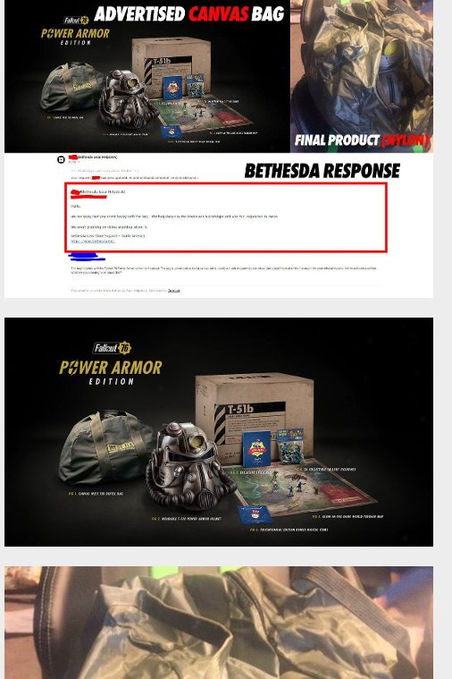 Bethesda工作室在广告宣传中称《辐射76》动力装甲版将附赠一款帆布包,但最终产品中附赠的却是一款尼龙包,材质廉价,做工也显得粗糙,引起了许多玩家不满,甚至纷纷抗议并要求退款。现在这一事件继续发酵,根据知情人士透露,帆布包其实是给主播和网红的赠品。
