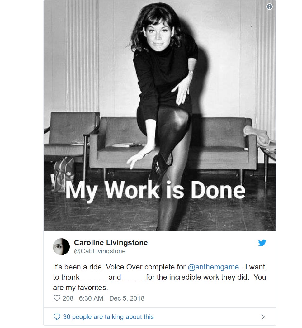 BioWare配音总监兼制作人Caroline Livingstone在Twitter上宣布《圣歌》的所有配音工作已经完成,非常感谢配音演员惊人的付出。