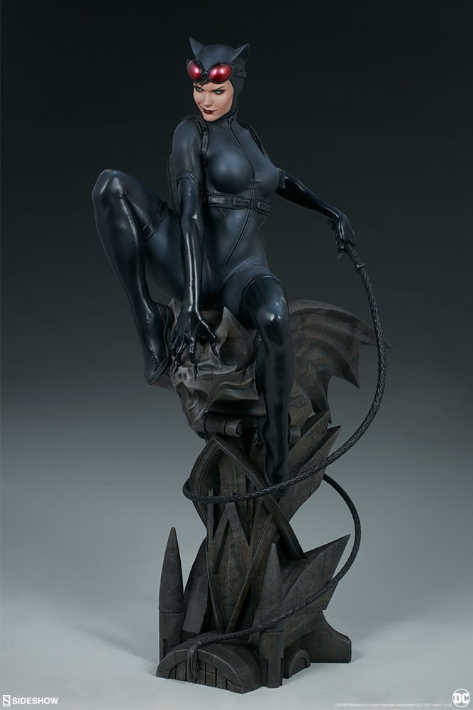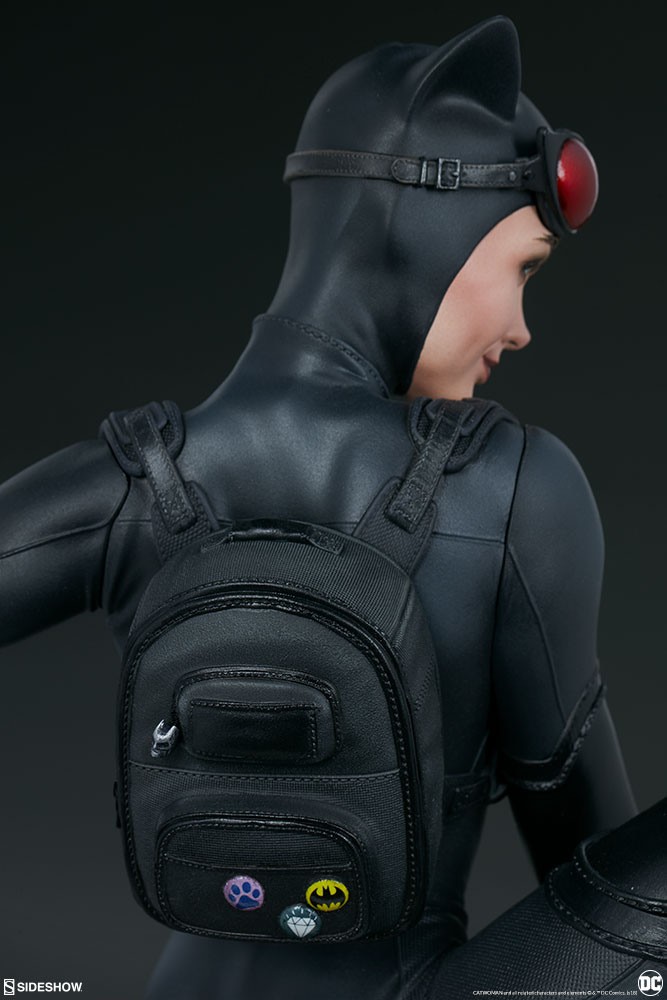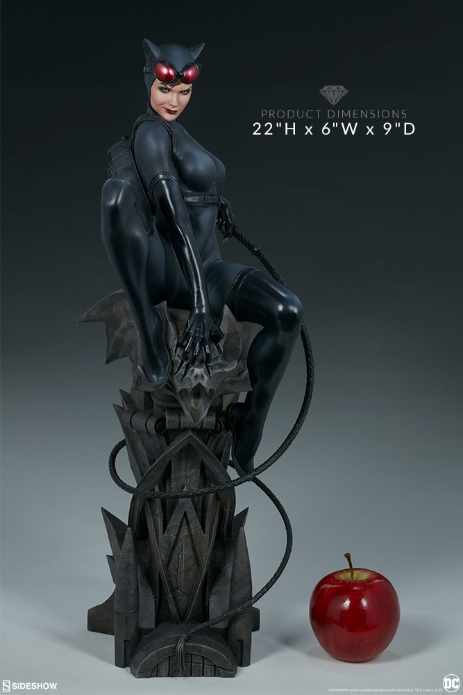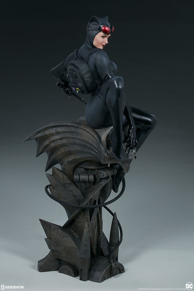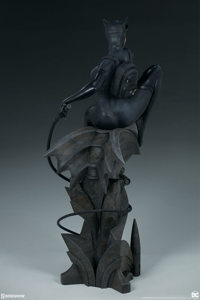 这款猫女手办高约55.8公分,猫女坐在蝙蝠石像上,手拿长鞭,右爪将蝙蝠像的脸划破。她眼神犀利看着远方,似乎在寻找下一个偷盗目标。