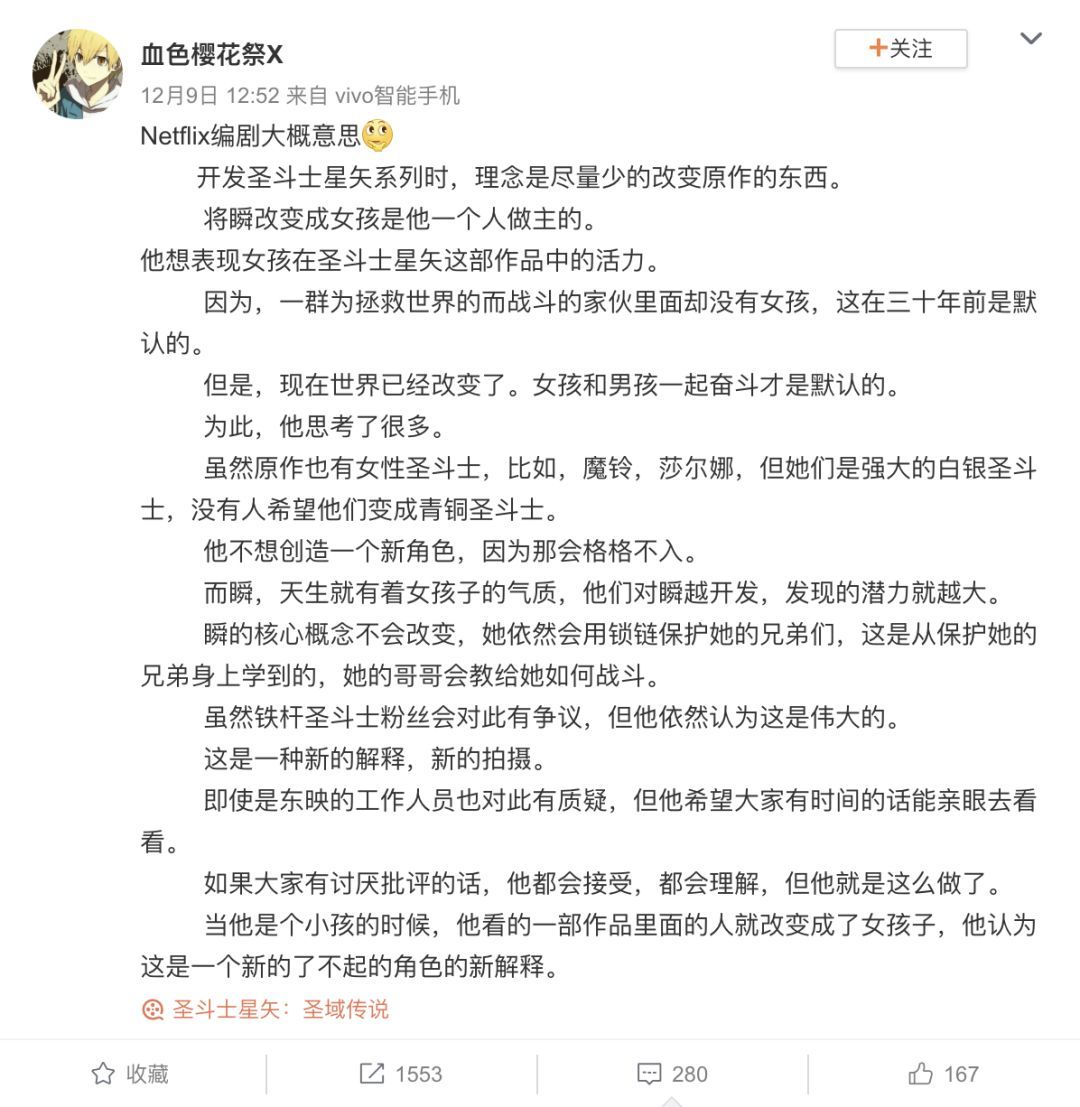 但编剧给出的解释似乎并不能说服粉丝,有网友认为编剧根本不懂《圣斗士》,把瞬变成女性不对。也有网友觉得3D化对原版艺术风格进行了破坏,配音方面也不尽如人意。