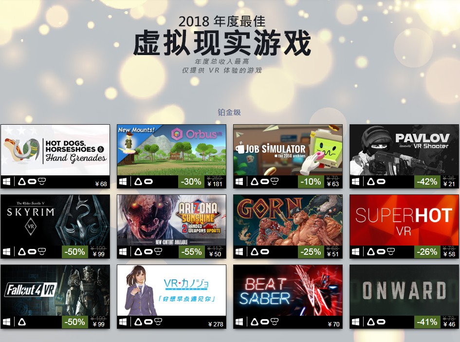 铂金级:《热狗、马蹄和手榴弹》《Orbus VR》《工作迷你器VR》《Pavlov VR》《上古卷轴5:天际VR》《亚利桑那阳光》《GORN》《SUPERHOT VR》《辐射4 VR》《VR女友》《节奏光剑》《ONWARD》