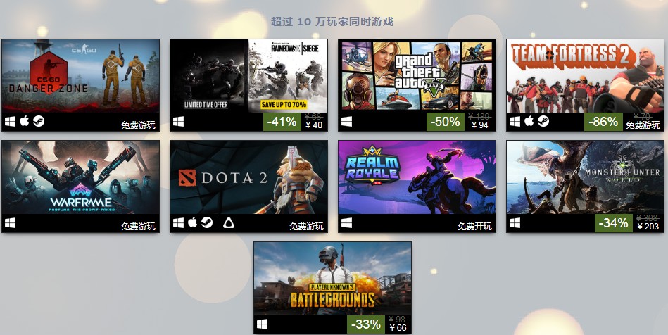 《CS:GO》《彩虹六号:围攻》《侠盗猎车手5》《军团要塞2》《星际战甲》《DOTA 2》《Realm Royale》《怪物猎人:世界》《绝地求生:大逃杀》