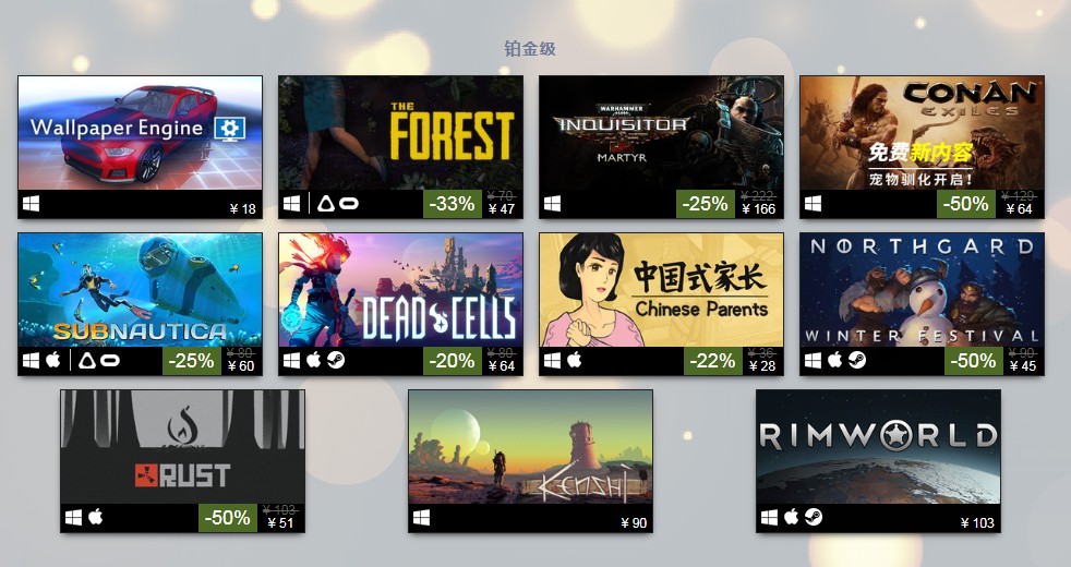 《Wallpaper Engine》《森林》《战锤40K:审判官-殉道者》《流放者柯南》《美丽水世界》《死亡细胞》《中国式家长》《北地》《RUST》《剑士》《边缘世界》