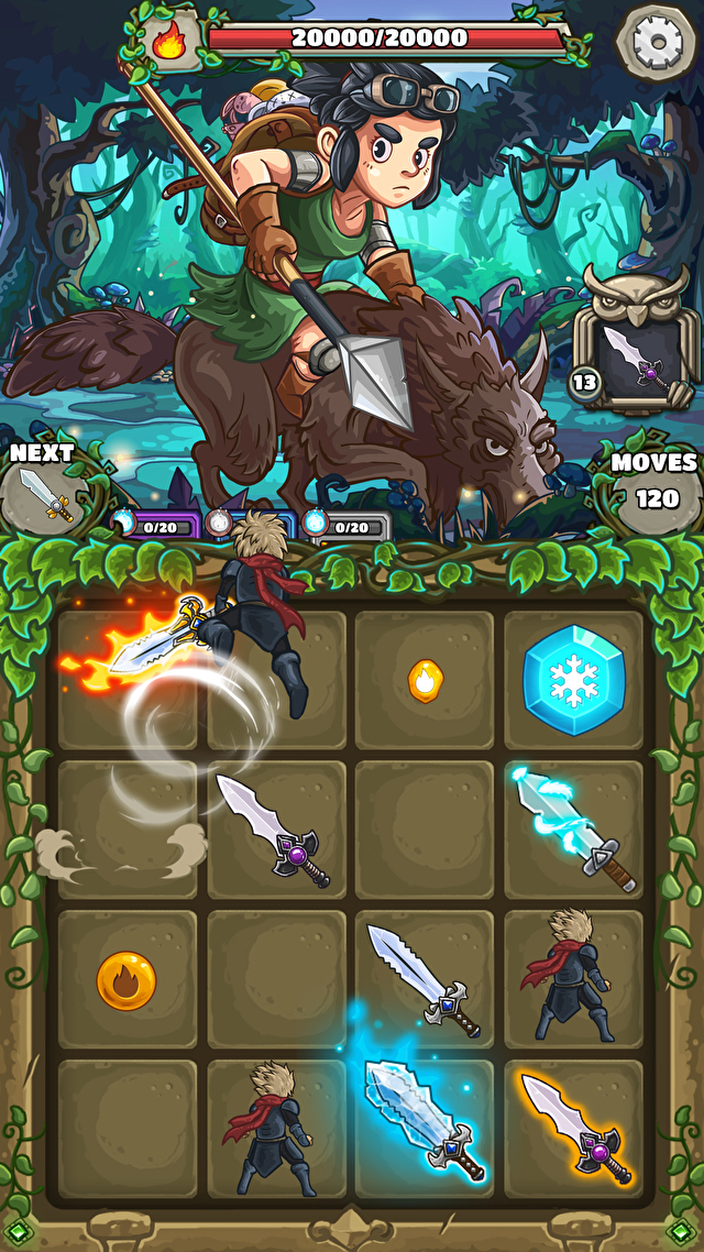 《下一把剑》是一款利用滑动与合成来进行战斗的益智闯关游戏,战斗中有四种物件:英雄、剑、冰、火,两个相同种类的物件可以合成出更高等级的物件,让英雄使用最厉害的冰剑与火剑击倒敌人。
