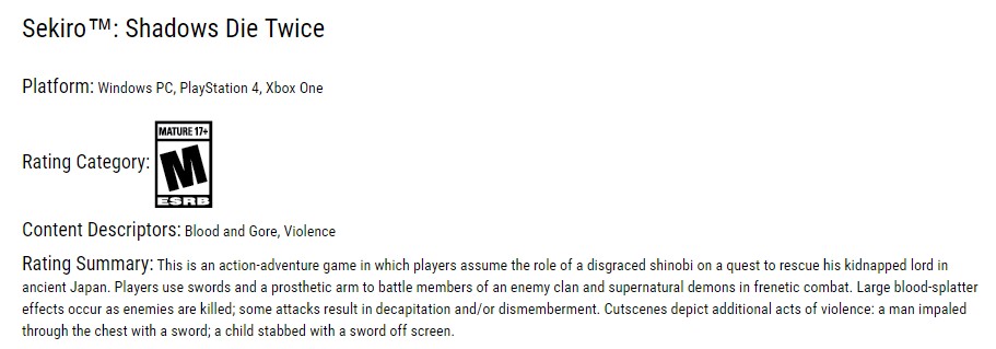 ESRB:《只狼:影逝二度》是一款动作冒险类游戏,游戏的背景设定在日本的战国时代,玩家需要扮演一个身背耻辱的忍者去营救他被绑架的主公,玩家使用剑和假肢来对抗大量的敌人并与之展开狂热的战斗,游戏中甚至还会出现超自然恶魔。当敌人被杀死时会发生大量的血液飞溅效果; 某些特殊攻击还会出现斩首和断肢效果。游戏的过场动画中描绘了大量暴力行为,如:一名男子被剑刺穿胸部,一个孩子被剑狠狠刺伤。