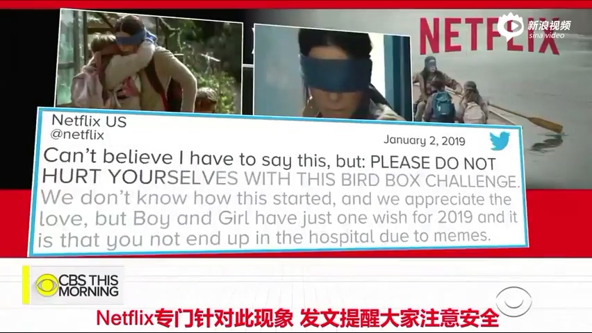 根据视频,影片上映后,“蒙眼”挑战一夜之间风靡社交网络,甚至有不少人蒙着眼睛开车,给交通安全带来了重大隐患。另外视频中有家长蒙着眼睛带着孩子在屋内游玩蒙眼游戏,导致孩子撞在了墙上。针对这种现象,Netflix专门在Twitter上发文请求民众不要模仿以免伤到自己。