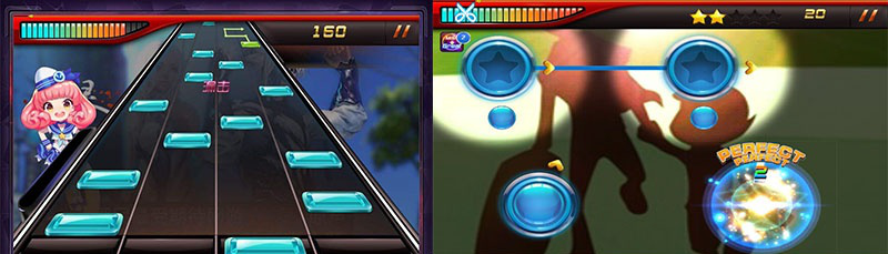 这种玩法的特点在于note是由中间向两边辐射,在这种模式下,玩家只需要用大拇指就可以完成整个打歌过程,操作相对更易上手。