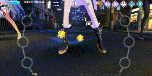 这种模式的操作区域分布在屏幕的左右两侧,每侧从上往下有三个均匀分布的按键。打歌时,note从屏幕中心飞到两侧的按键上。整体是一个颇具“镜头感”的界面形式。