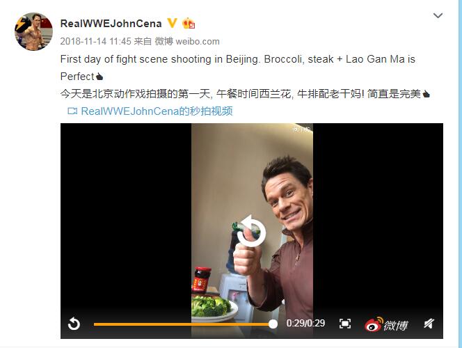 WWE摔角巨星约翰·塞纳主演的《大黄蜂》正在热映中,自约翰·塞纳去年在北京接触到"老干妈"后,就立刻爱上了它。吃西餐拿老干妈拌西兰花拌牛排,成为老干妈国际无偿代言人,最后还很认真地说:不是广告!