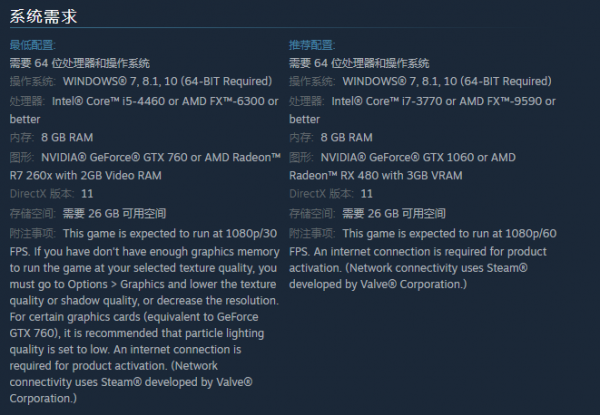 图形: NVIDIA GeForce GTX 1060 或 AMD Radeon RX 480 with 3GB VRAM
