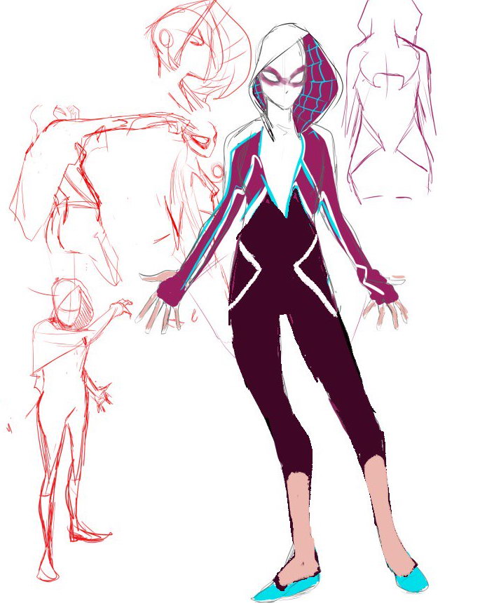 首先,它必须代表一个不同的宇宙时空;其次,它必须符合故事的设定。因为她的秘密身份她在电影中一开始总是充当背景,但作为一个超级英雄,她又是充满正义光明和独特的。最后,服装必须是另一位设计师Robbi Rodriguez能够反复创作并从中找到快乐的,如果蜘蛛侠艺术家讨厌画网的时候,这很棘手。