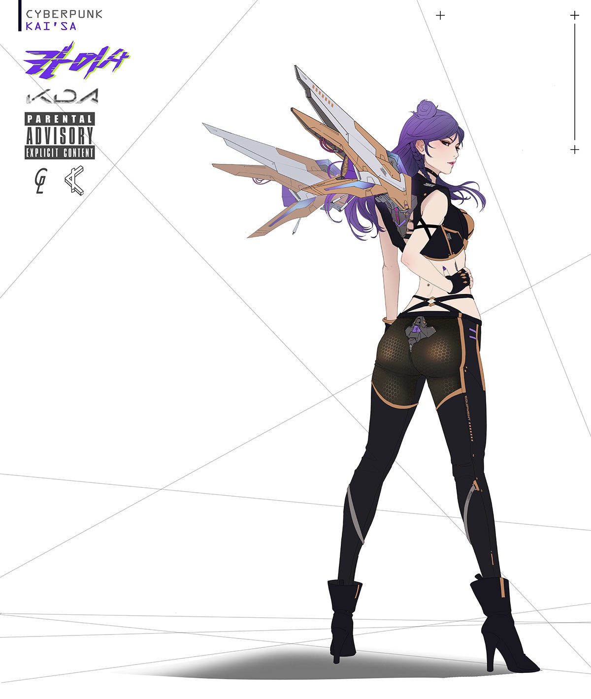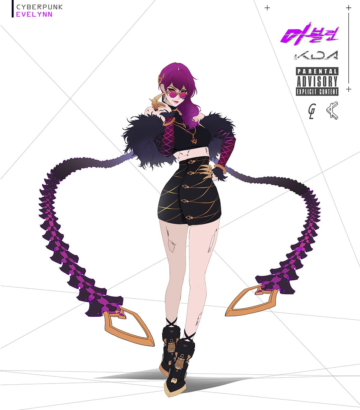 这组设计图的角色造型以原版皮肤为基础,添加了赛博朋克元素。阿狸手臂和腿变成了机械义肢,伊芙琳的针刺和卡莎的翅膀也充满科技感。