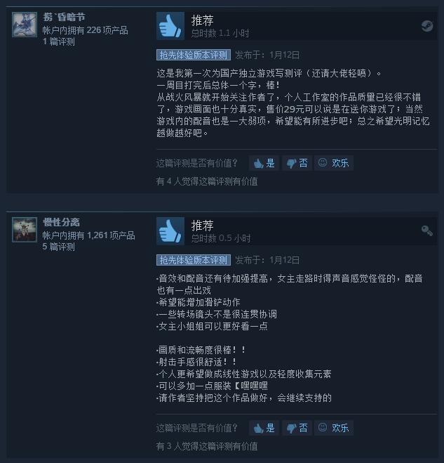 飞燕群岛在《光明记忆》这款游戏上选择了国产游戏并不多见的章节式发售模式,游戏上线之后,在Steam平台上收获了不错的评价,好评率达到97%。在玩家意见中,本作剧情、手感、画面、流畅度都相当不错,而且29元的售价非常亲民。除了部分特效场景会有显著降帧以及配音效果有点问题之外,作为一款FPS游戏所需要的爽快感份额是足够的。