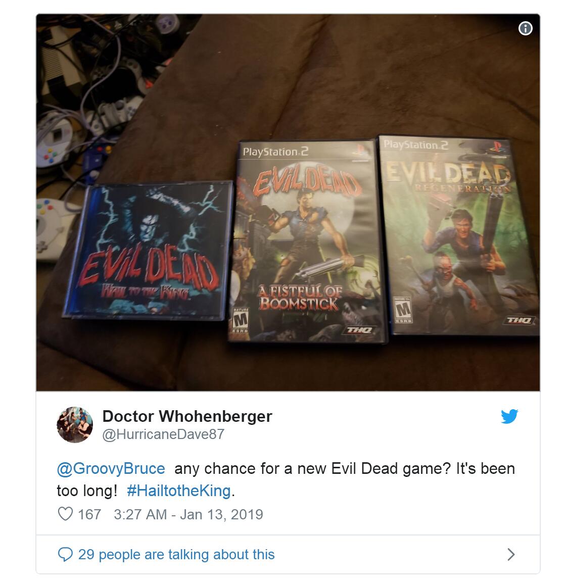 在这位玩家推特上,可以看到三款《鬼玩人》系列游戏,分别为《鬼玩人:致敬国王》 (PC/PSX/SEGA DC),《鬼玩人2:死亡之书》(PC/PS2/Xbox)和《鬼玩人:尸变重生》(PC/PS2/Xbox)。