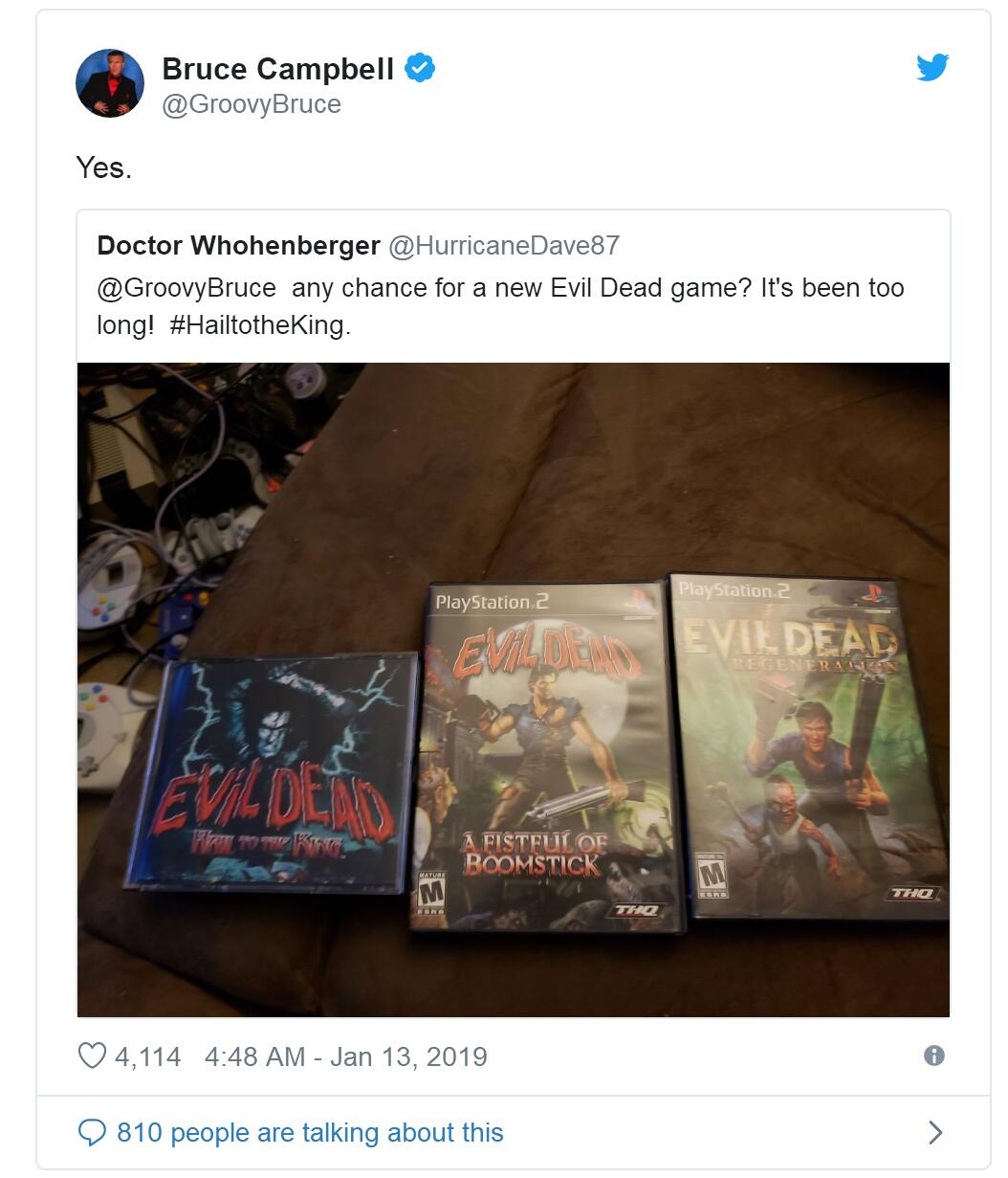 好莱坞经典恐怖电影《鬼玩人》已经很久没有推出游戏改编作品,上一次推出还是2011年,近日,有玩家在推特上提问是否会有新的《鬼玩人》游戏,系列主演布鲁斯·坎贝尔在推特上给与了肯定的回答。