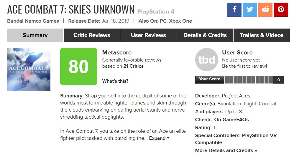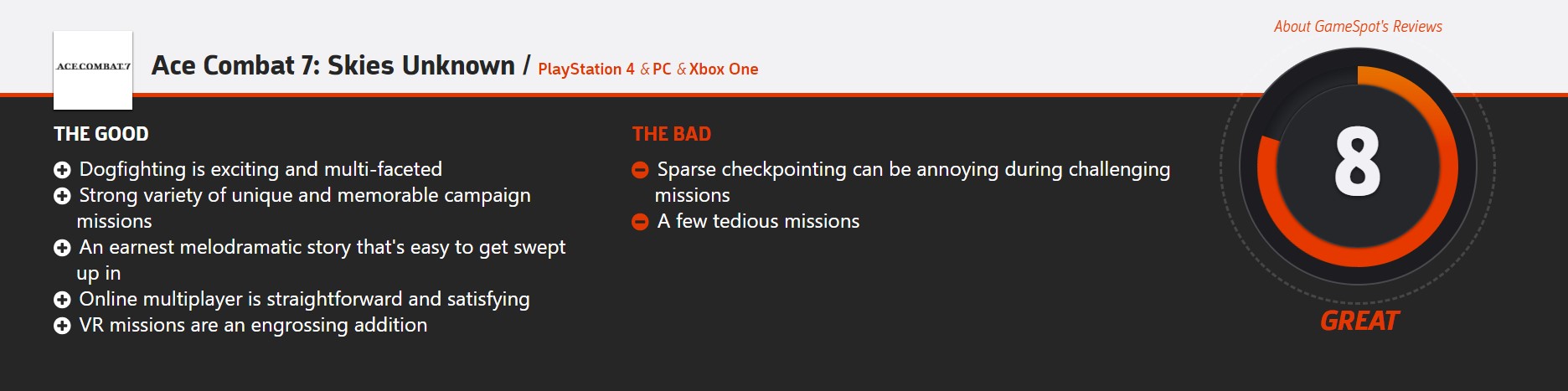 “《皇牌空战7:未知天空》是一个画面很美的街机飞行战斗游戏,在高品质的地形上空呼啸而过,努力地进行导弹锁定、躲避敌机,趣味横生。但游戏体验经常被怪异、令人费解但还算流畅的故事以及糟糕的沟通目标所拖累。尽管足以证明这个系列在市场上仍占有一席之地,有回归的必要,但《皇牌空战7》肯定不是开启这个大门那一个游戏。”