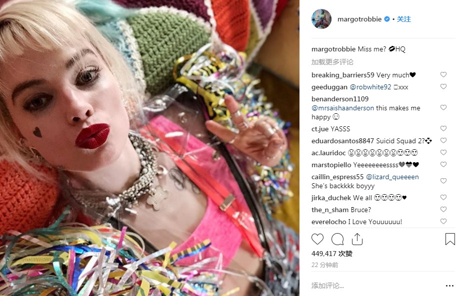 近日《自杀小队》“小丑女”扮演者玛格特·罗比在网上放出自拍,她在DC新片《猛禽小队》里的新造型曝光。只见她手比剪刀手,嘟起小红唇,并配文:“想我了吗?”还以红唇和哈莉·奎因缩写HQ结尾。