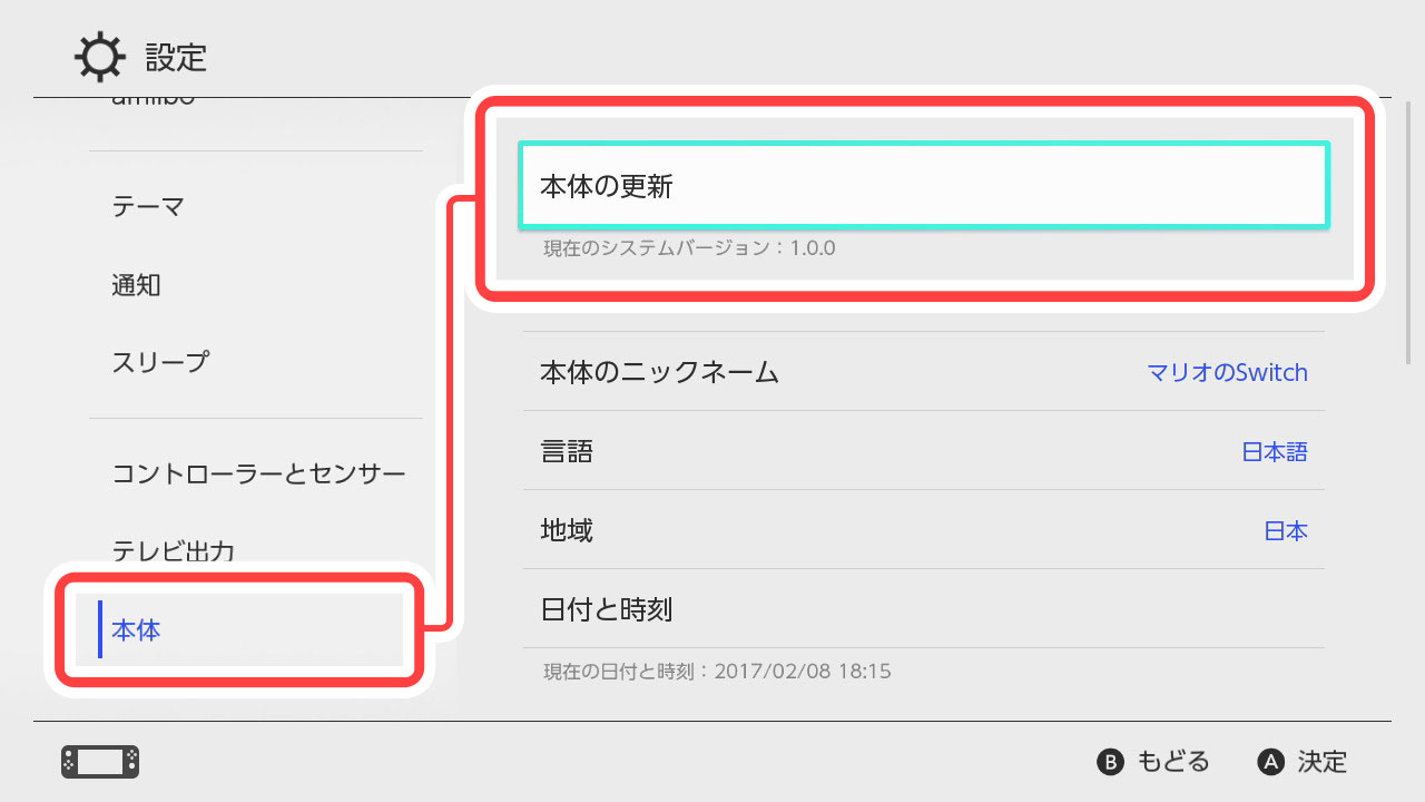 要更新中文补丁,需先将NS主机连接网络,然后在HOME选单的“设定”-“本体(主机)-本体の更新(主机更新)”下进行设定,这样就能下到官方中文了!