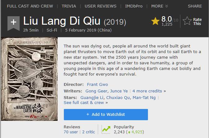 目前豆瓣网友就《流浪地球》给出的评分为8.0分,较之昨天的8.2分有所下滑。而IMDB目前给出8.0分,比昨天高出0.1分。(IMDB——互联网电影资料库,世界权威电影网站)