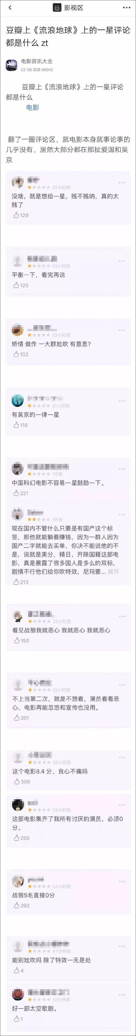 为什么IMDB评分上涨,而国内的豆瓣网评分却变低了呢?有网友翻了翻豆瓣上,给《流浪地球》打一星的评论:
