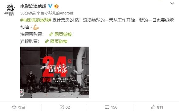 2月12日最新数据显示,在突破20亿大关之后,《流浪地球》总票房势如破竹,截止到今天10点46分,其累计票房已破24亿。截稿前,《流浪地球》票房已24.03亿元。当日票房占比超60%,排片占比高居第一,达到38%。另一方面,和《流浪地球》一起火起来的还有一句在影片当中处处不在的交通提示语“道路千万条,安全第一条,行车不规范,亲人两行泪”。