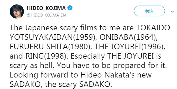 小岛秀夫:《女幽灵》真的是太**吓人了,看片之前务必做好准备。同时大家一定要去看中田秀夫导演的新作《贞子》,真的很恐怖。