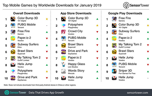 至于在下载排行方面,休闲益智游戏《Color Bump 3D》在整体排行中夺下第1 名;主打拼图益智玩法的《Polysphere》则是前10 名中唯一的一款新作,整体排名第9名,同时也是App Store 2019 年1 月份下载排行榜第2 名。