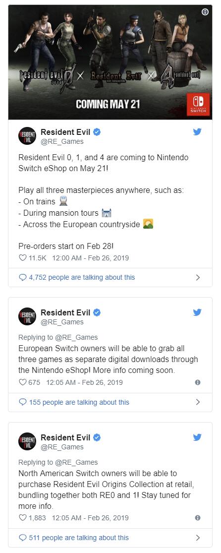 所有三款游戏都将于5月21日登陆任天堂eShop,欧洲玩家可以单独购买每款游戏,北美粉丝可以购买实体版的《生化危机:起源合集》,包括高清化0和1代。