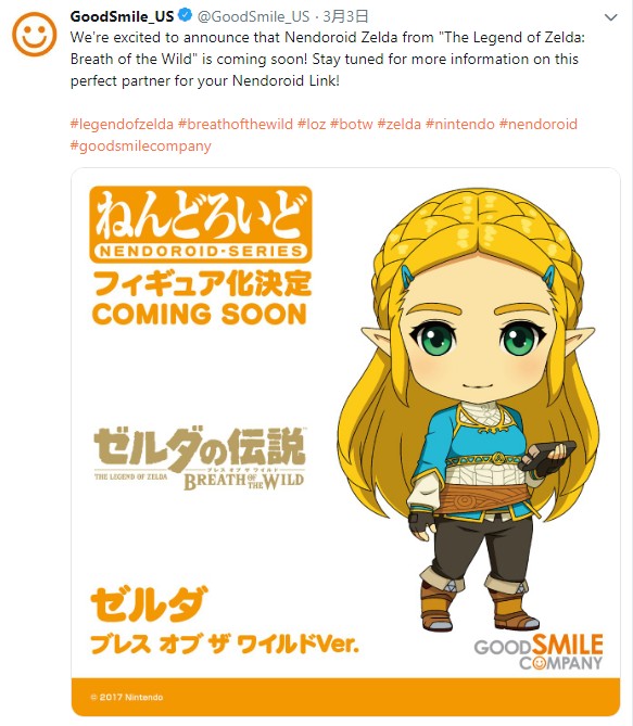 Good Smile(美国)官方推特:我们很高兴地宣布《塞尔达传说:荒野之息》中塞尔达公主的黏土手办要来了!请继续关注这款林克完美搭档的最佳黏土手办!